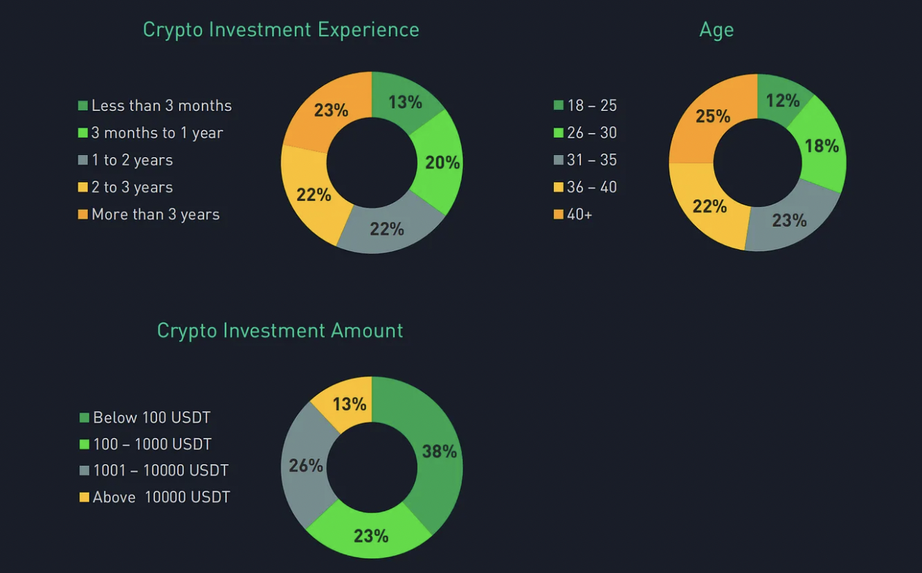 在调查的 1,000 多名受访者中,30% 的受访者是 18 至 30 岁,45% 的受访者是 30 至 40 岁,40 岁以上的投资者则仅占 25%。相比较年轻的投资者更看好加密货币市场;较年长的投资者认为在自己的投资组合中,投资加密货币让他们感到感到满意。