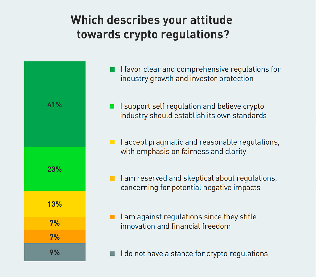 人们对加密货币监管的各种态度,反映了加密货币行业的微妙本质。 约 41% 的受访者表示强烈支持明确而全面的监管,强调需要结构化监管,认为这将促进行业增长并保护投资者。