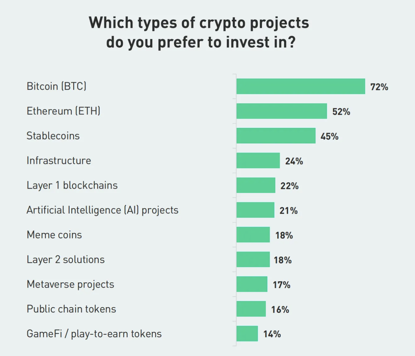 比特币通常被称为「数字黄金」,是阿联酋用户最喜欢的加密货币投资选择,72% 的用户表示偏好。 这种响亮的支持反映了比特币作为可靠的价值储存手段的全球声誉,体现了其作为首选数字资产的持久地位。