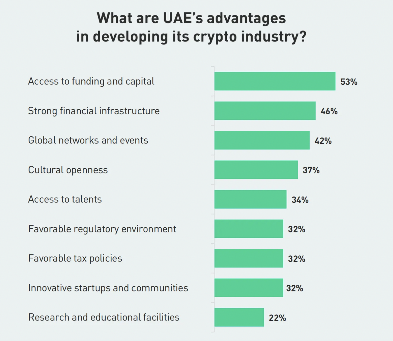 拥有才华横溢的劳动力、有利的监管环境和税收政策(分别得到 34% 和 32% 的认可)进一步增强了阿联酋作为加密货币热点的吸引力。全球网络和活动(占 42%)进一步凸显了阿联酋的加密货币吸引力。 这些国际网络和行业活动为知识交流、协作和培养全球关系创造了宝贵的机会。