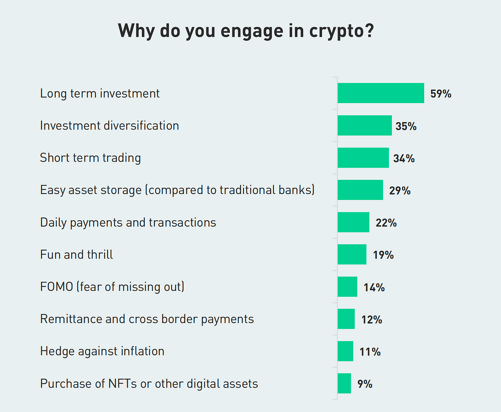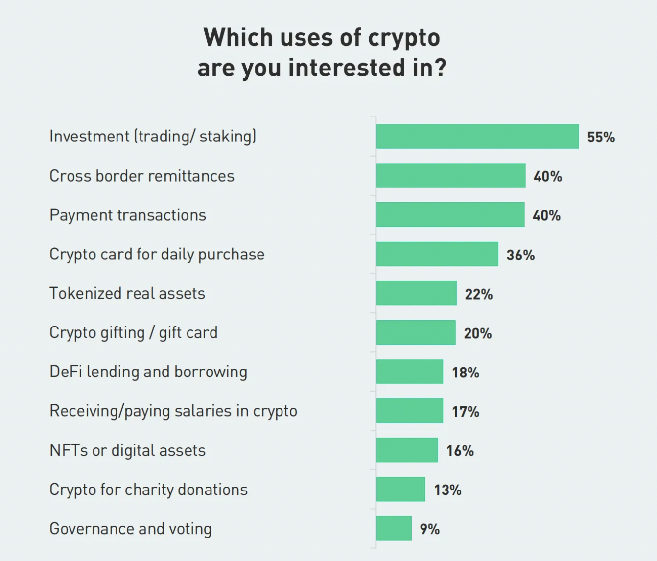 与传统金融相比,29% 的受访者认为加密货币是更便捷的资产持有方式,因为加密货币正在被认可为除了金融投资之外还有更多用途: