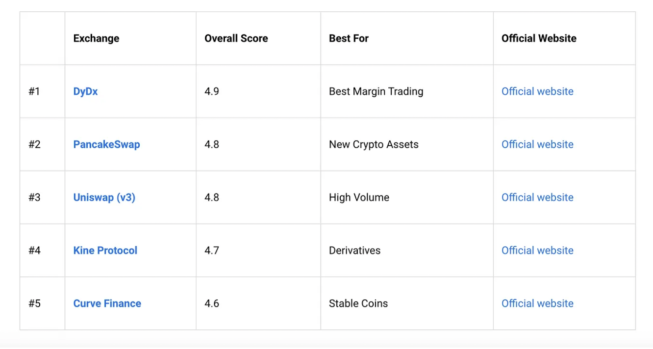 迪拜(阿联酋)用户在 CEX 和 DEX 上的热力分布,分别为 45.7% 和 48.4%,相差很小,当地最佳经纪商评论网站 Business24–7,在筛选、评估、比较了阿联酋现有的 174 个 CEX 和 89 个 DEX 后,对区域内最受欢迎的 CEX 和 DEX 做了排名:
