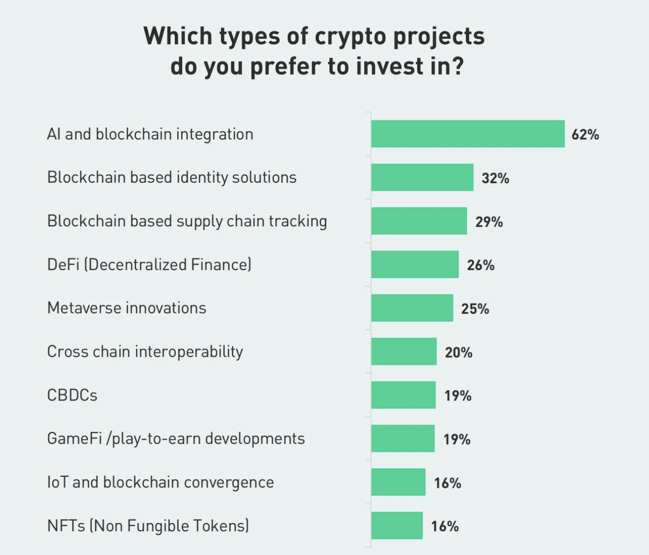 调查中的数据显示,人们对加密世界和加密生态系统的兴趣日益增长,并从游戏扩展到社交互动、商业和教育等各个领域。凸无论是通过人工智能和加密领域的融合、基于区块链的身份的安全性,还是供应链跟踪的透明度,这些创新正在重塑加密货币格局,并为更先进、更具包容性的金融和数字体验铺平道路。