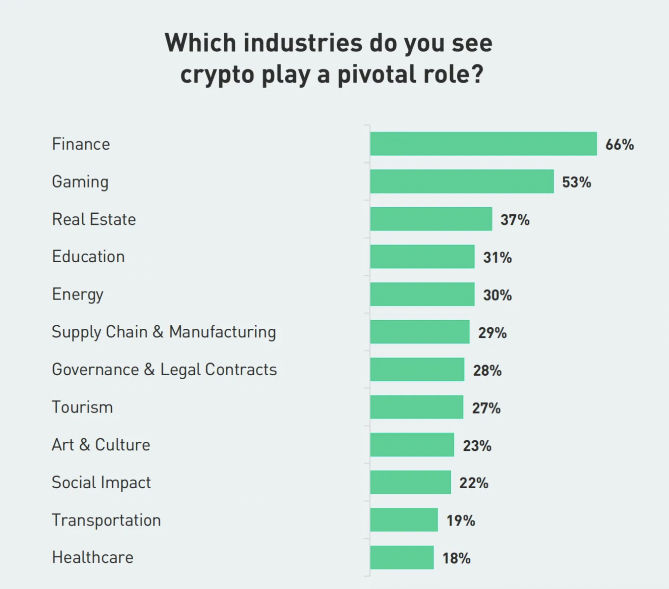 还有 37% 的受访者认为房地产是另一个即将发生重大变化的行业,区块链在房地产交易中的透明度可以有效减少购买过程中的摩擦,这可能会彻底改变房地产行业,使交易更加高效和安全。
