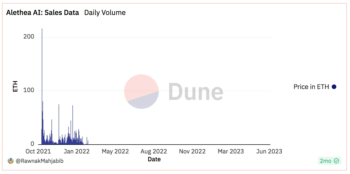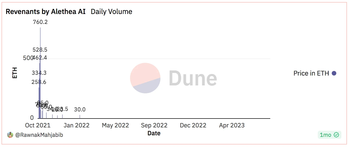 从 Dune 看板统计的数据我们可以看到,无论是出售给第三方的 Intelligence Pod,还是 Alethea.ai 第一方发行的 Revenants collection,都在初始发行一段时间后逐渐销声匿迹。这其中的主要原因,笔者认为应该还是最初的新鲜感退去之后,没有实际价值或者社区热度留存用户的缘故。