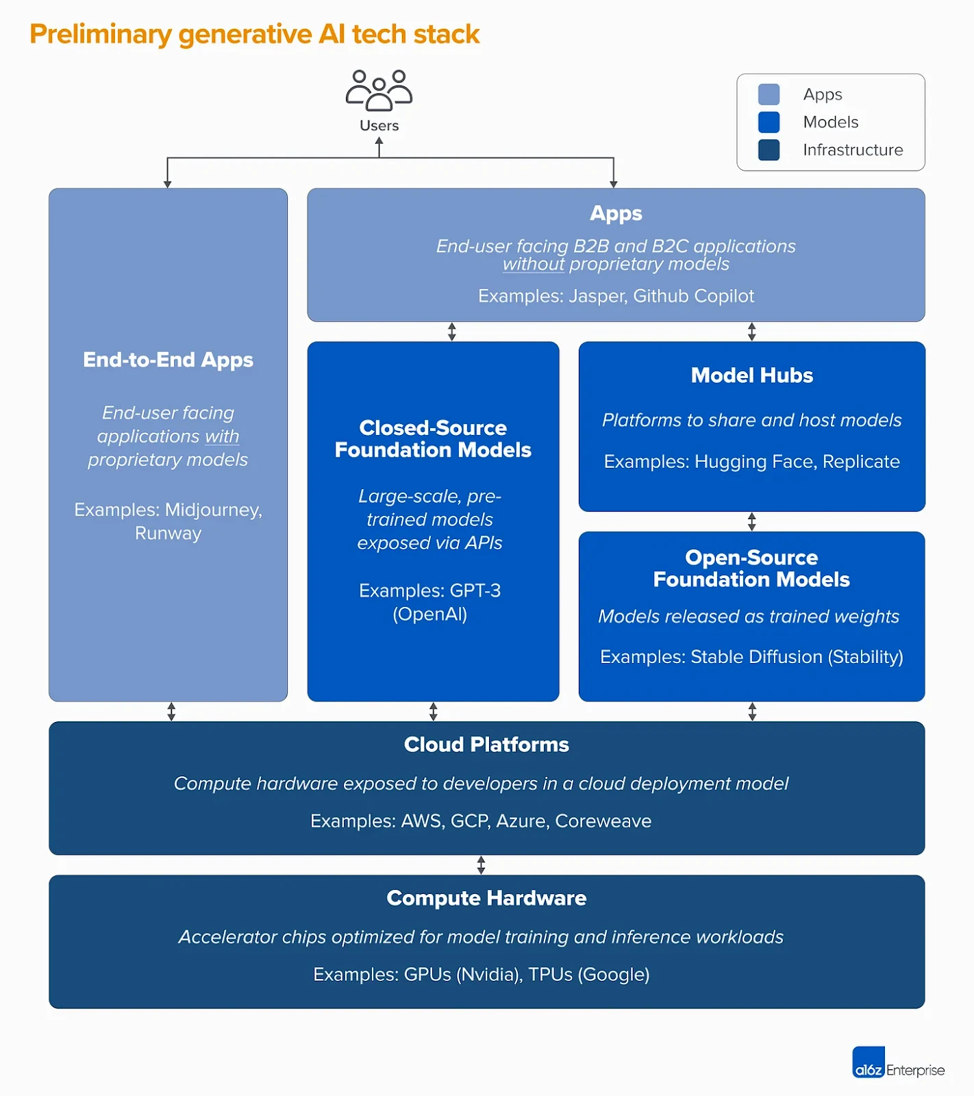 很多过往的优秀文章都从不同角度讨论过了生成式 AI 对已有技术构架的意义,比如这篇来自A16z 的文章《谁拥有生成式 AI 平台?》,其中全面总结了生成式 AI 目前的技术构架: