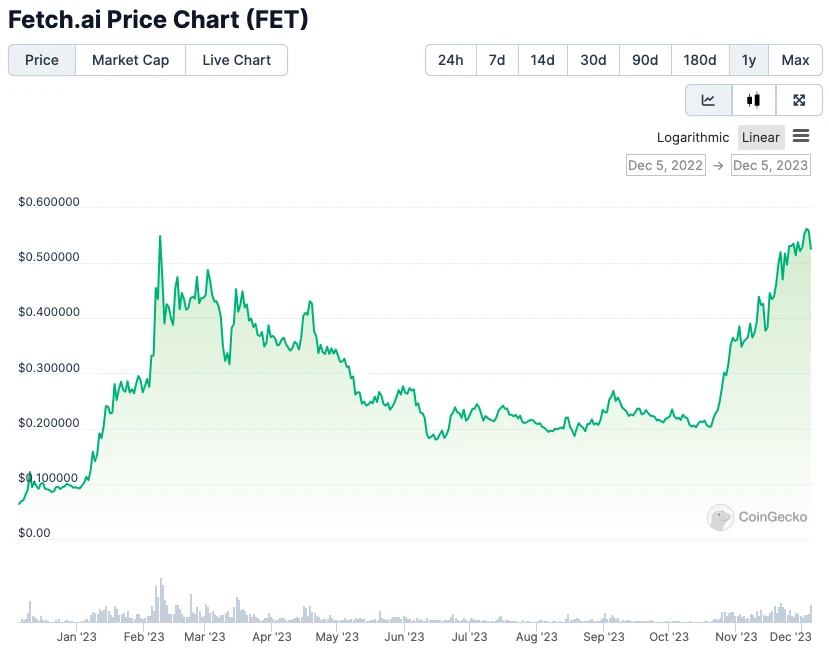 从项目启动以来,Fetch.ai 已经以稀释代币持有的方式接受过多轮融资,最近一次是 2023 年 3 月 29 日,Fetch.ai 接受了来自 DWF Lab 3000 万美元的融资。由于 $FET 代币并没有项目收入方面的价值捕获,所以价格提升的驱动力主要还是来自于项目更新和市场对于 AI 赛道的情绪。可以看到,借着 AI 板块的两次热度,Fetch.ai 的价格在 2023 年初和 2023 年底均有一次超过 100% 的价格飙升。
