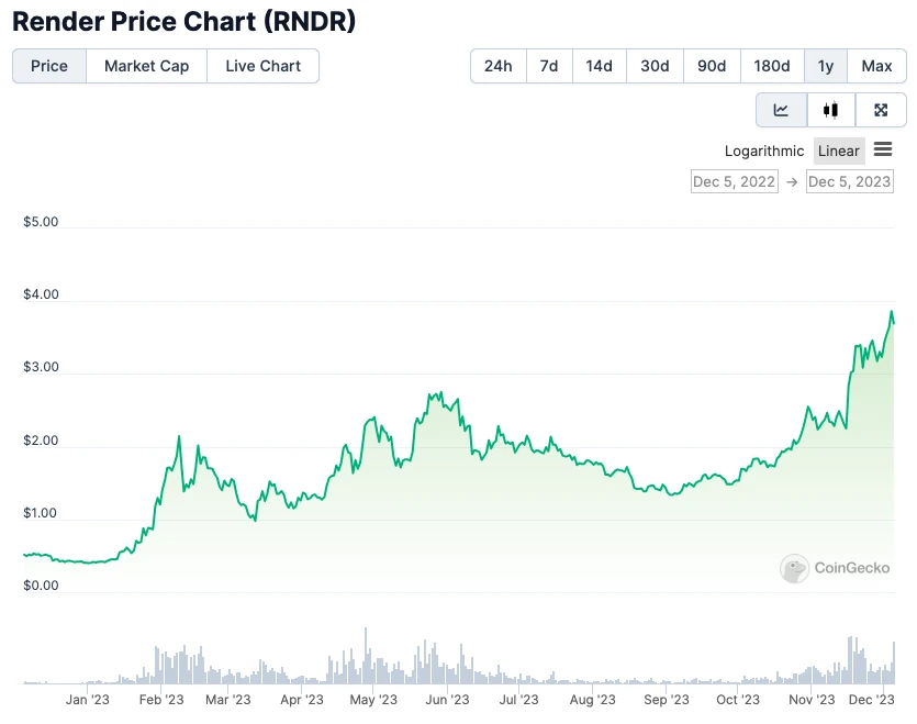 由于 Render 是自主研发了高性能渲染器 Octane Render 的 OTOY 公司,加上确定的商业逻辑,所以上线之初就被认为是自带需求和基本面的 Web3 项目。在生成式 AI 风靡的这段时间里,需求大幅增长的分布式验证和分布式推理任务完美契合 Render 本身技术架构,也被认为是其未来值得期待的发展方向之一。同时 Render 近些年常年占据 Web3 领域 AI 赛道的龙头位置,已经衍生出了一定程度的 meme 性质,每次有 AI、元宇宙、分布式计算等叙事热潮时总能吃到上涨红利,可谓是较为全能了。