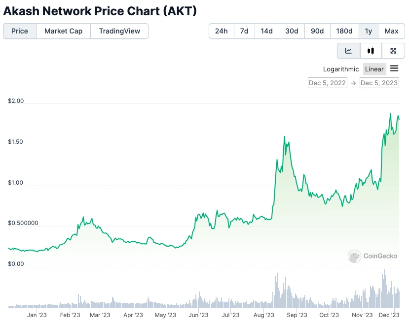 由 coingecko.com 上显示的价格趋势可以看出,$AKT 的价格在 2023 年 8 月中旬和 11 月下旬也分别迎来一次上涨,但仍不如 AI 赛道中其他项目的同期涨幅,这可能和当下的资金情绪倾向有关。总体来看,Akash 的项目作为 AI 赛道的几个优质项目之一,基本面优于绝大多数 AI 赛道的竞争者。其潜在业务收入有可能为协议未来盈利带来机会,随着 AI 产业的发展和对于云计算资源的愈演愈烈,相信在未来有望看到 Akash Network 在下一个 AI 大浪潮中扶摇直上。