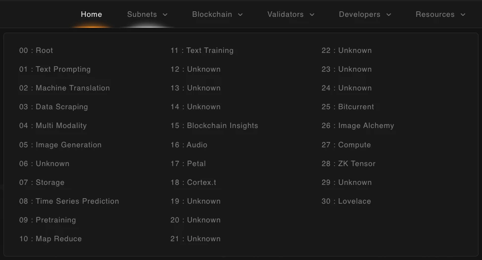 需要注意的是,在绝大多数子网中, Bittensor 本身并不训练任何模型 ,其发挥的作用更像是链接模型提供者与模型需求者,并在此基础上更进一步的利用小模型之间的互相作用提升在不同任务中的性能。目前已经上线(或曾经在线)的子网已经达到 30 个,分别对应不同的任务模型。