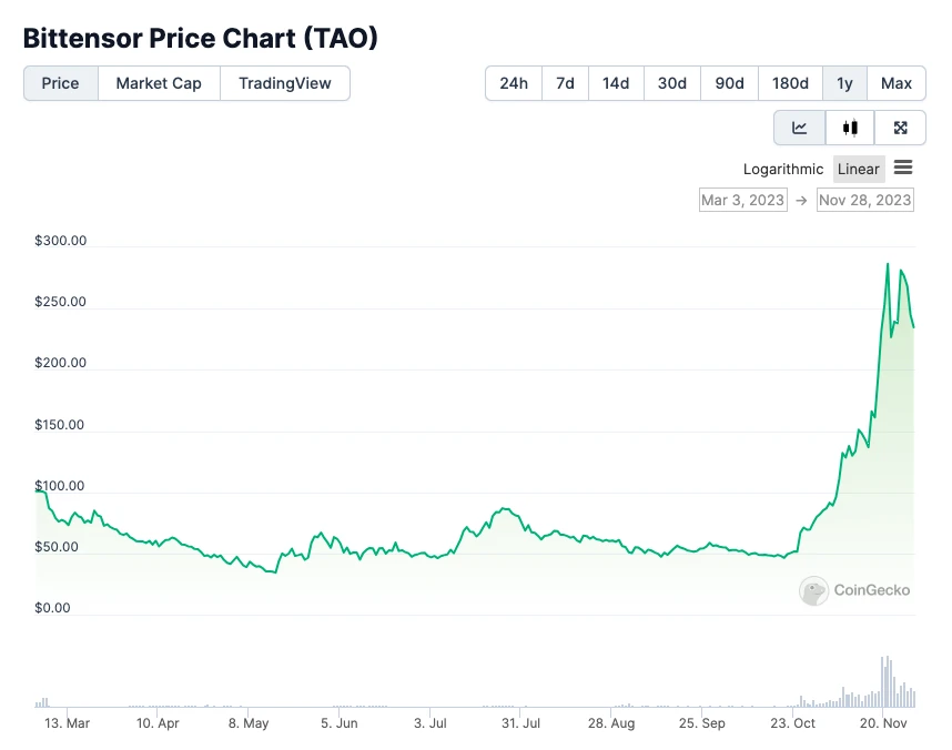 由价格趋势可以看到 $TAO 的价格从 2023 年 10 月末起经历了一次大幅上涨,推测其中主要推动力是包括 OpenAI 的发布会带来的新一轮 AI 热潮,使得资金板块轮动到 AI 板块。同时 $TAO 作为 Web3 + AI 赛道的新兴项目,其优秀的项目质量和长远的项目愿景也是吸引到资金进入的一大原因。然而不得不承认,同其他 AI 赛道的项目一样,虽然 Web3 + AI 的组合潜力巨大,然而其在实际业务中的应用还不足以支撑起一个长期盈利的项目。