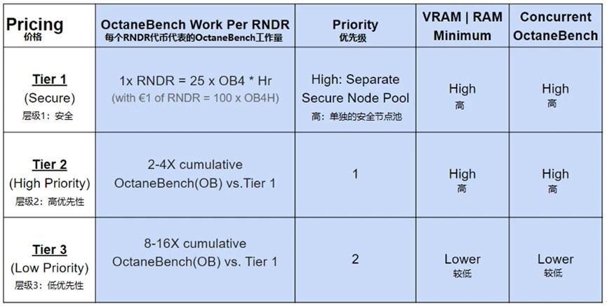 Render Network 发布的 新的定价分级制度 将链上的服务分为了三个档次,由高至低分别对应不同价位和质量的渲染服务,可以由渲染需求方自行选择。