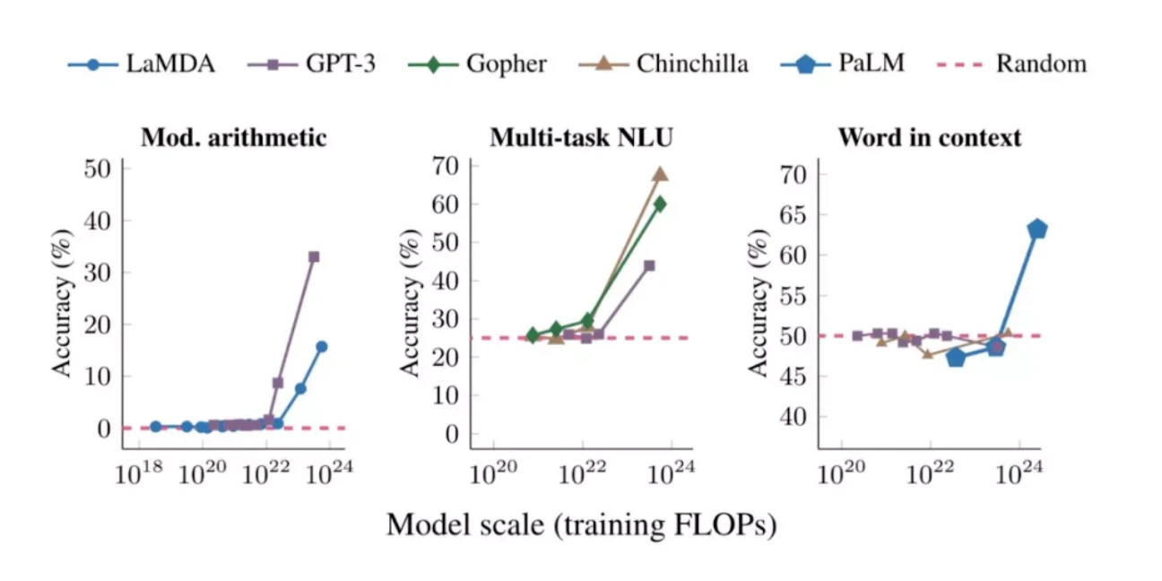 数据在未来 AI 发展领域是建立技术壁垒的核心。 为了理解其重要性,我们先来看一项关于大模型性能来源的研究。这项研究表明,AI 大模型展现出一种独特的 涌现能力 :即通过不断增加模型规模,当超过某个阈值时,模型精度会突然暴增。如下图所示,每张图代表一个训练任务,每条折线达标一个大模型的性能(准确率)。各种不同的大模型上的实验均获得了一致的结论:模型规模超过一定阈值之后,在不同任务上的性能都表现出突破式增长。