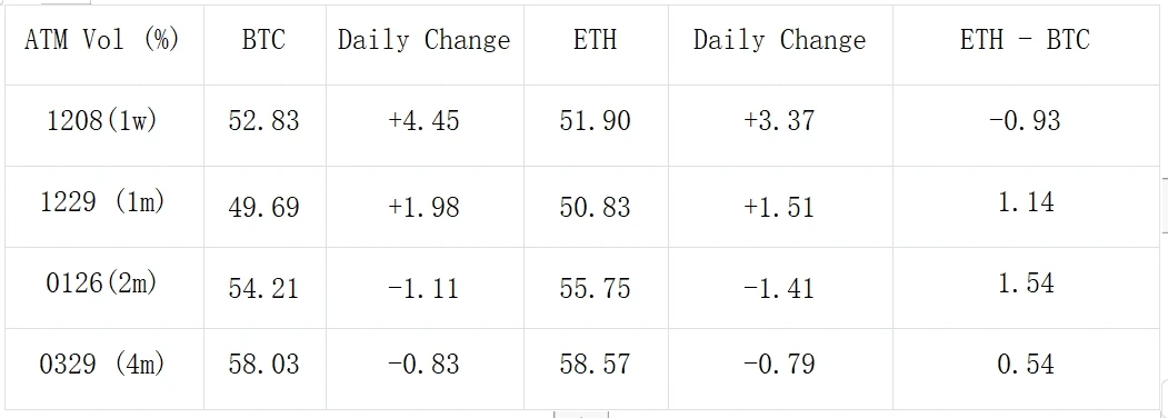 数字货币方面,BTC 多头在经过一天的调整后再度向更高点发起挑战,一夜之间价格再涨 5% ,收报 43619 美元,ETH 弱势联动,收涨于 2267.3 (+ 2.92% )。实际波动的上涨再度拉动了前端 IV 的上扬, 29 DEC 23 仍以局部低点的角色成为曲面斜率走平的分割点。此轮上涨行情在某种程度上可以被解读为对 1 月 SEC 批准 BTC SPOT ETF 审核的正面预期的下注,BTC 期权成交量受此提振创下近期新高,其大宗上再度出现了以 26 Jan 24 42000 vs 50000 Long Call Spread 为代表的看涨策略,中短期内也不乏一些以 Sell Call Spread 形式出现的滚仓操作,一同表达了对后市上行空间的展望。除此之外,BTC/ETH 两币种在中短期内还有不少买入 Put Spread 策略,实现了下行场景下对仓位的保护。