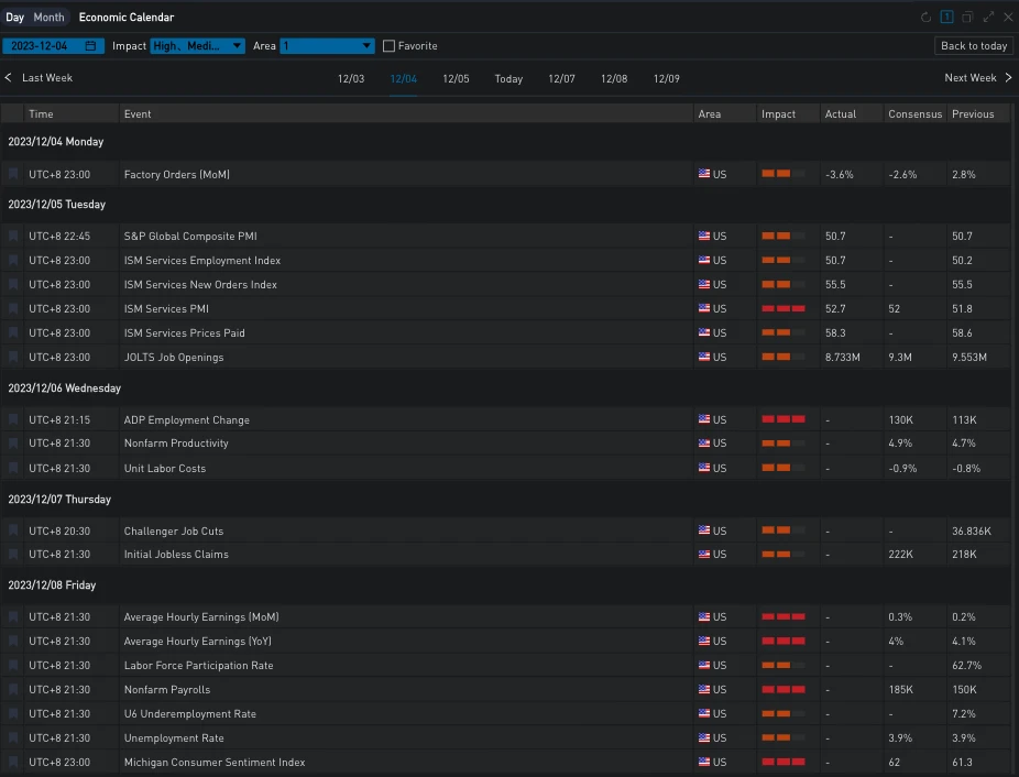 昨日(5 Dec)美国 ISM 服务业指数因商业活动的增加而得到回暖,录得稍高于预期的 52.7 ,另一份 JOLTS 职位空缺数据录得 8.733 M,远低于预期的 9.3 M,为 2021 年 3 月以来最低,凸显了美国劳动力市场降温的迹象,美债收益率受此影响继续下跌,十年期收益率跌破 4.2% ,现报 4.19% ,对利率政策更为敏感的两年期收益率先跌后涨,现报 4.614% 。美股交投平淡,标普和道指分别收跌 0.06% 和 0.22% ,纳指收涨 0.3% 。
