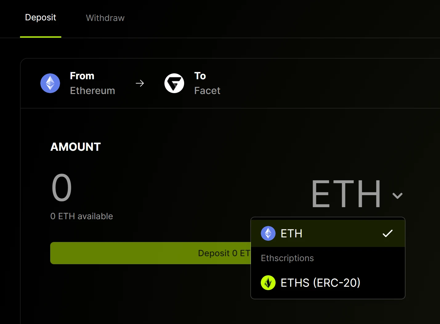 用户若想购买 FacetSwap 的代币,需要通过其官方桥,将 ETH 转换到 FETH,才能购买相应的代币。值得强调的是交易手续费还是 ETH 来结算。