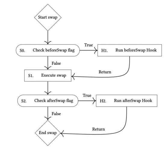 下图展示了兑换钩子的逻辑流程。在执行兑换前后,有一个专用的布尔标志,可以在这些特定点执行自定义代码。这是开发高级功能的基础,如预言机、动态收费体系、拍卖和高级订单类型等功能。我们将在下文更深入地探讨这些概念。