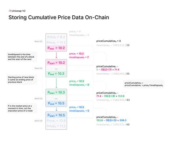 Uniswap v2 提供可供众多 DeFi 应用程序使用的链上价格信息。这些价格信息不易被操控,因此非常有价值。该机制会将区块结束时的价格添加到核心合约的累积价格变量中,该变量根据特定价格存续的时间长度进行加权。该变量本质上代表了合约整个历史记录中每秒 Uniswap 价格的总和。