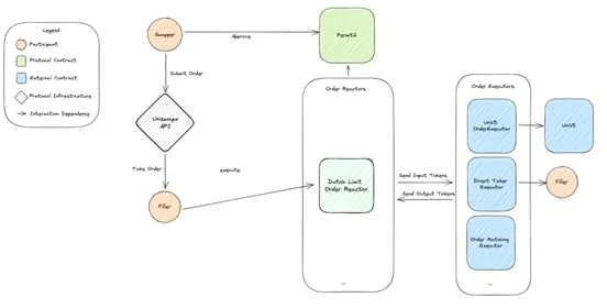 UniswapX 协议的体系结构如下所示。兑换者通过 Uniswap API 提交其意图订单,其结构为 Permit 2 可执行的链下签名。Permit 2 是一款设计精良的模型,可确保用户持有的代币安全转移。填充者设计各种策略,使用任何可用的流动性场所来完成这些订单,无论是在链上还是链下。最后,订单反应器解决 UniswapX 订单。他们负责验证特定类型的订单,将其解析为输入和输出,根据填充者的策略执行订单,并验证订单是否成功实现。