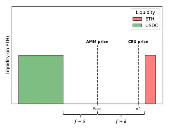 Alex Nezlobin(@0x 94305)提出了一种简单有效的动态费用体系,该体系考虑了前一个区块的价格影响,并对买家和卖家应用不同的费用标准。如下图所示:当 CEX 价格移动至 p*,即高于当前 AMM 价格 p_AMM 时,售出费用减少δ,而购入费用增加δ。δ的值与 AMM 价格的变化成正比。这种动态费用体系的目的是区分套利者和不知情的资金流。套利流与价格变动自相关的可能性更大。