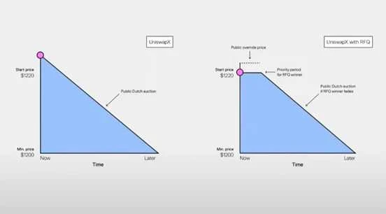 目前,在 Uniswap 实验室对 UniswapX 的接口实现中,协议被分为两个阶段。第一个是 RFQ 阶段,白名单上的「报价人」用报价回应订单。然后,报价的获胜者有一个排他期来完成订单。如果没有完成订单,就进入第二阶段——荷兰式拍卖阶段,即任何填充者都可以参加拍卖。计划在不久的将来使报价系统完全无需许可。