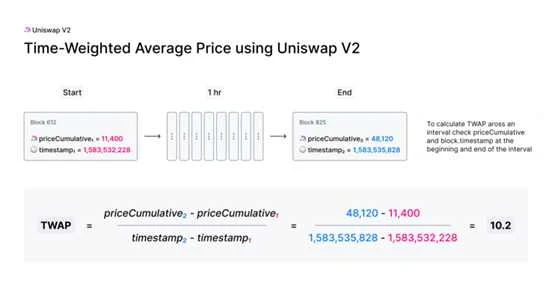 外部合约可以利用该变量来准确跟踪任何指定时间间隔内的时间加权平均价格(TWAP)。在时间间隔开始和结束时读取 ERC 20 代币对的累积价格,计算二者的差值并将其除以时间间隔长度,即可得到该特定期间的 TWAP。
