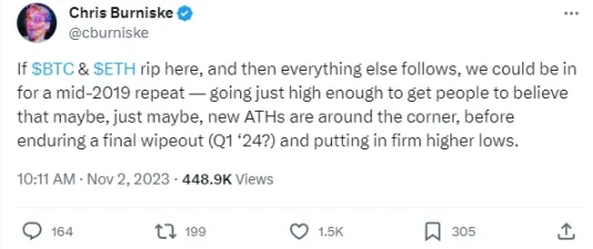 所以结论是:我相信我们会看到类似于 2019 年的情况,当人们期待新的历史最高点时,我们会在某个时候看到一次下跌。这条推文几乎概括了我认为会发生的事情: