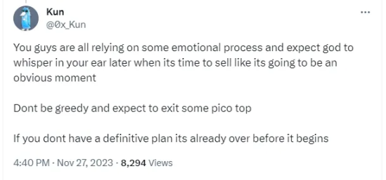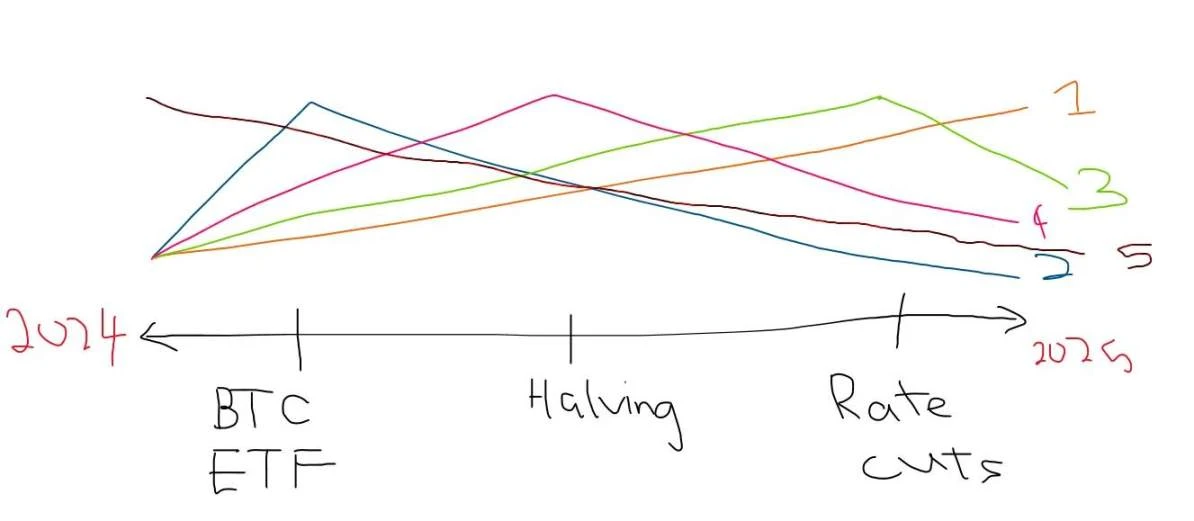 我相信 2024 年将主要由机构主导 ,随着比特币 ETF 的推出和对加密货币的越来越多关注,这是显而易见的。叙事实际上只是炒作,每个人都在上车,并试图在其他人之前下车。