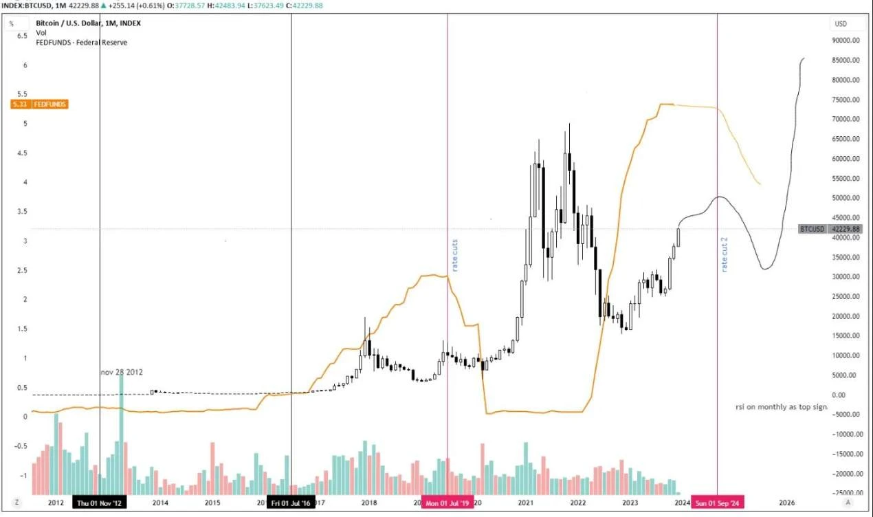 2019 年与我们现在面临的情况惊人地相似。我相信这是最有可能的事件:我们在 2024 年的某个时候因利率削减看到一个局部顶部,然后开始几个月的下降,再然后进入我们有史以来看到的最大牛市。