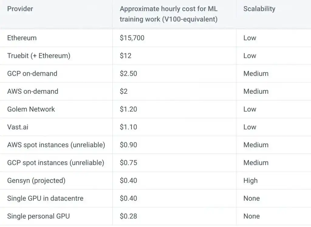 Gensyn 的机器学习训练工作的每小时成本约在 0.4 美元,远远低于 AWS(2 美元)和 GCP(2.5 美元)等所需成本。