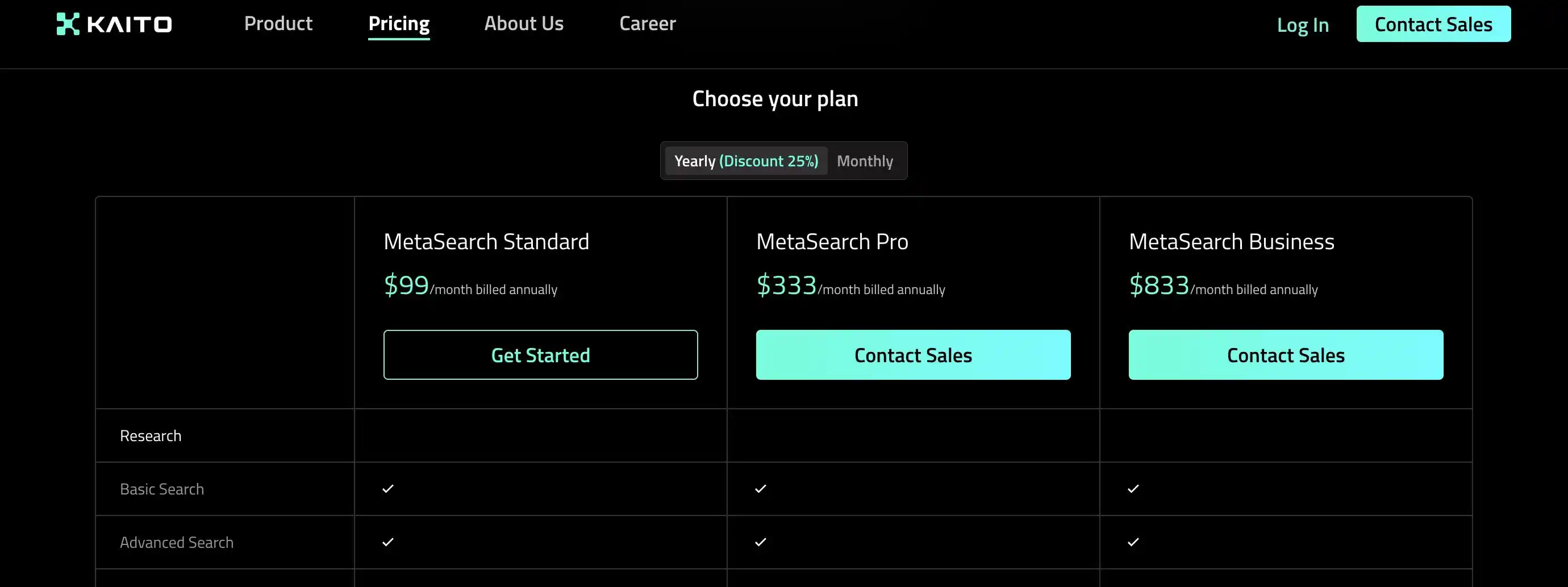 MetaSearch 是 Kaito 的主要产品。通过 MetaSearch,用户能够一键式搜索加密领域的所有平台,包括: Twitter 、Discord、治理论坛、 Mirror 、Medium 等。