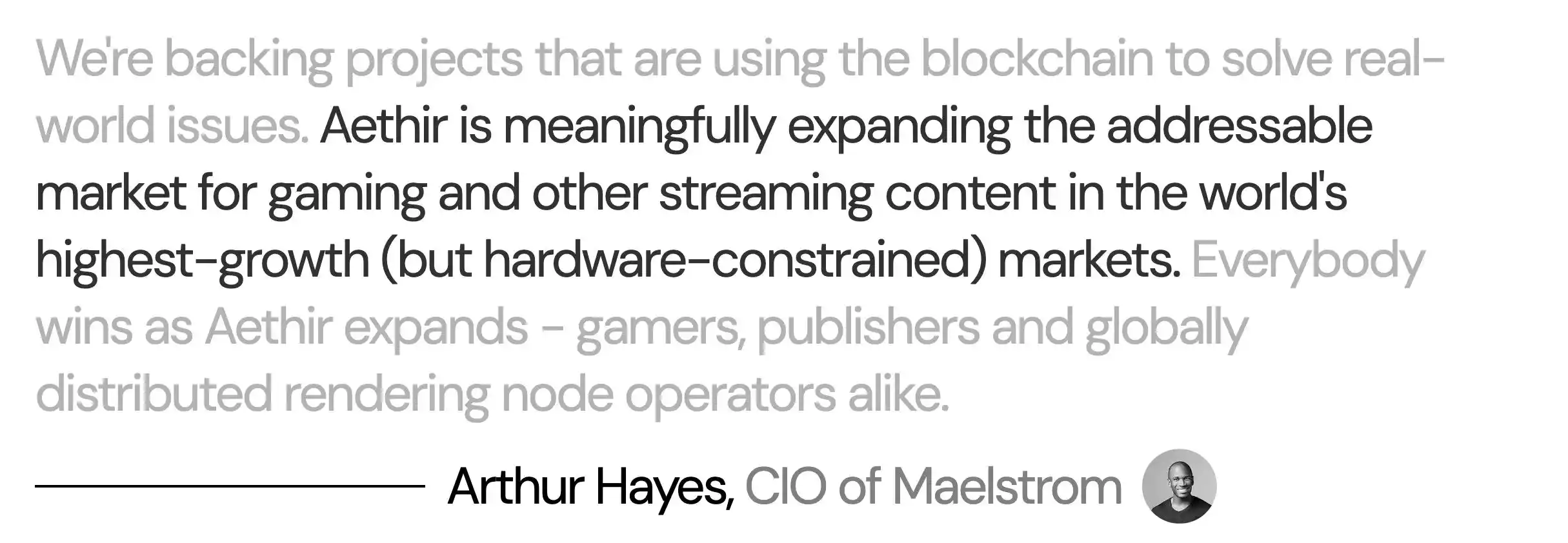 正如 Arthur Hayes 所说,Aethir 正在有意义地扩大全球增长最快(但硬件受限)市场中的游戏和其他流媒体内容的潜在市场。随着 Aethir 的扩张,每个人都会受益——游戏玩家、发行商和全球分布的渲染节点运营商等。
