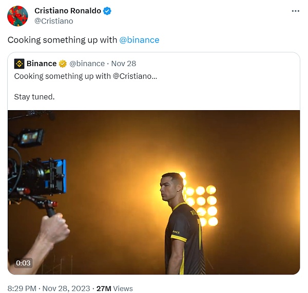 当时还是BA CEO的赵长鹏表示:“C罗是世界上最好的足球运动员之一,他的影响力已经超越了体育,成为了一个多领域的明星偶像。通过他的真实、才华和慈善,在全球积累了最忠实的粉丝群体。我们很高兴能够为他的粉丝提供一个平台,让他们能够拥有与C罗更紧密的联系。”