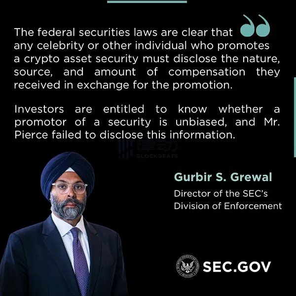 面对 SEC 对于自己违反联邦证券法的反兜售和反欺诈规定的指控,皮尔斯没有否认调查结果,同意了结这些指控并支付 140.9 万美元的罚款、没收所得和利息,同样三年内不再推销任何加密资产。