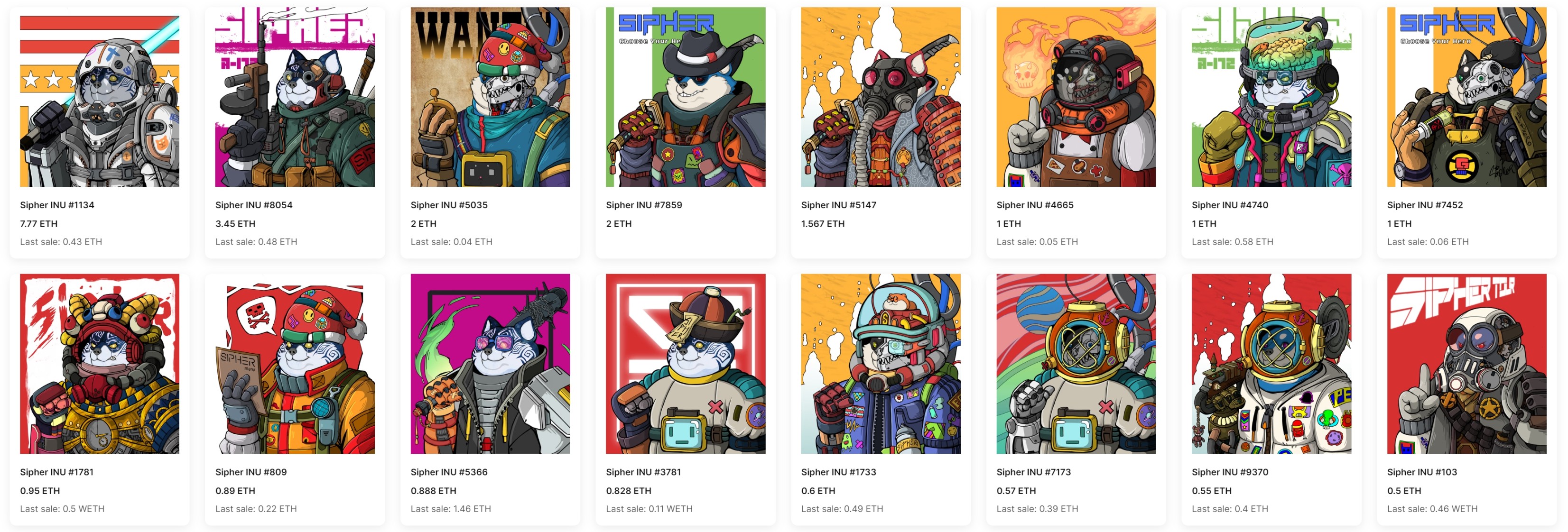 角色 NFT 以柴犬作为设计形象,总量 10000 个,起售价 0.1 eth,在当时开售不到 15 分钟全数售罄。地板价如今已回升至 0.08 ETH,月涨幅高达 96% 。历史总成交量为 6512 ETH,近一月成交量为 12.08 E,月涨幅达 184% 。