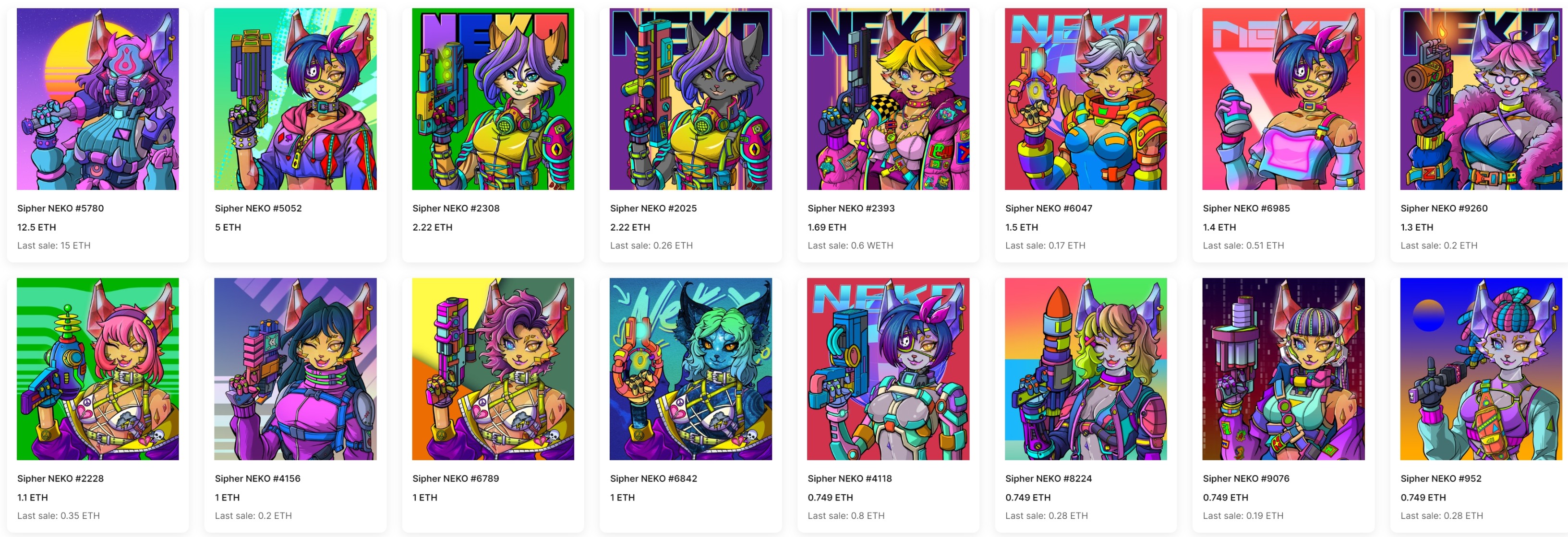 该角色以猫作为设计形象,NFT 地板价现为 0.0448 E,月跌幅为 0.44% 。历史总成交量超 1500 E,近一月成交量为 5.17 E,月涨幅到 76% 。