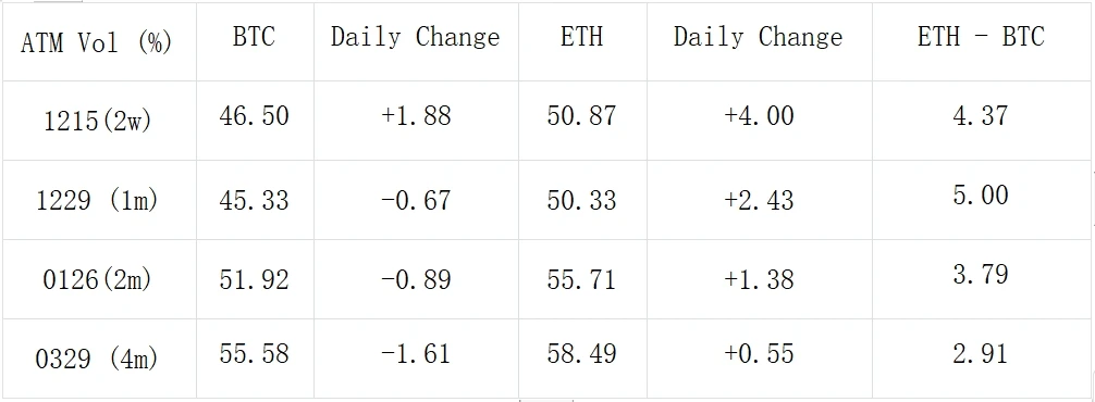 数字货币方面,BTC 还在 43000 支撑位上方坚守,ETH 则继续乘势向上触摸 2400 美元大关。两者价格上截然不同的走势也反应到了期权市场的变化上,具体来看,BTC IV 再度受 RV 拖累下滑,成交量也是大幅回落, 29 Dec 上一组 Short 44000 Straddle 以单腿高达 1000 BTC 的数量强势表达了看跌年底波动率的观点,同时该到期日上也有大量 43000 vs 40000 的保护性看跌价差成交;另一方面,受价格提振,ETH 呈现出截然不同的表现, 29 Dec 上 2400 的 Long Straddle 成交量达到 18000 组,同时 15 Dec 和 29 Dec 两个到期日上 2400 至 2800 行权价的看涨期权在大宗和 Deribit 散户平台上均有大量建仓购入,不仅抬高了这段的隐含波动率水平,也让 ETH 中前端的 Vol Skew 反弹回到高位。