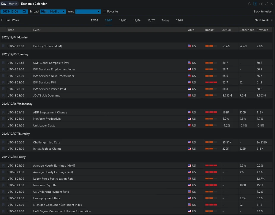 昨日(7 Dec)美国 12 月 2 日当周初请失业金人数录得 220 K,略低于预期 222 K,美债收益率先跌后涨,两年/十年期收益率分别报 4.622% 和 4.175% ,美国三大股指集体收涨,道指/标普/纳指分别收涨 0.18% /0.8% /1.37% 。今晚市场将迎来本周重磅数据非农就业指数,敬请留意相关风险。