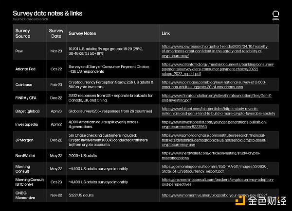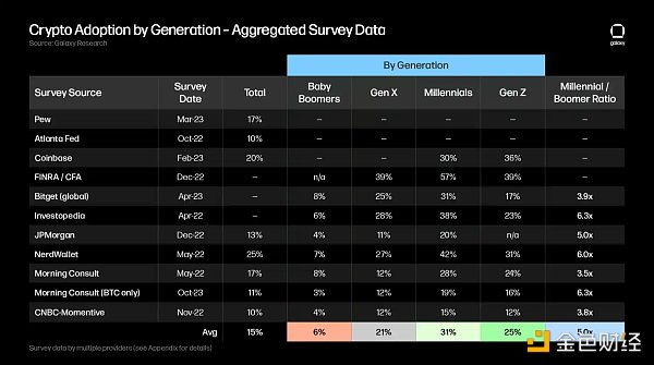 其他跟踪不同代际间加密货币采用的调查有稍微不同的估算,但每一个都得出了类似的发现:千禧一代的加密货币采用率是婴儿潮一代的几倍,平均为下表中所包括的调查中的 5.0 倍(附录中包含每个调查的详细信息和链接):