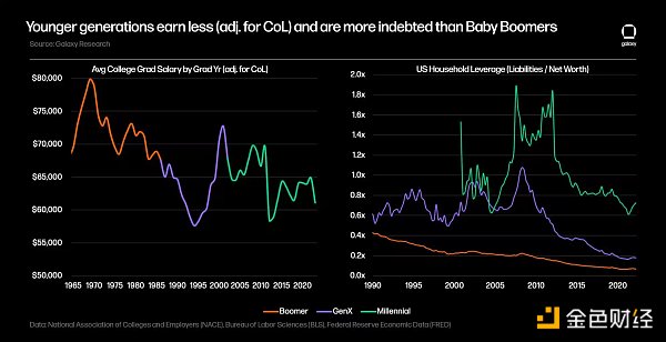 婴儿潮一代在二战后经历了繁荣的经济增长,深刻地改变了整个美国社会。然而,他们与千禧一代和更年轻的一代存在着明显的代际分歧,后者面临着比他们老一辈更大的经济压力。除了巨大的财富差距之外,数字原生代的社会价值观也截然不同,特别是在对技术的接受程度、社会意识以及对机构的信任方面。这使得这些群体更愿意接受比特币和加密货币等替代性金融系统。