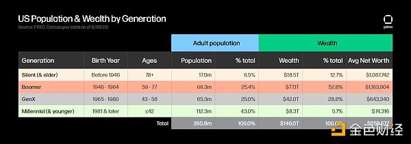 近年来,千禧一代超过婴儿潮一代成为美国人口最多的一代。尽管在人口规模上占优势,千禧一代及更年轻的一代(包括 Z 一代)总共持有 8.3 万亿美元(占总财富的约 5.7%),这相当于婴儿潮一代及更年长一代持有的金额的大约 11.5 倍,或者每人持有的金额大约少 15.5 倍。