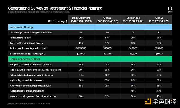 这些经济挑战对千禧一代的净财富与收入之比产生了负面影响,导致他们在类似年龄时投资或储蓄的能力和倾向落后于婴儿潮一代。更高的债务水平可能会推迟投资的开始年龄和储蓄的金额,并且还可能对年轻一代的风险行为产生影响。此外,传统的退休收入来源已经从社会保障和确定性养老金转向了确定性缴费计划(即 401(k) 计划),这将储蓄和投资管理的负担转嫁给了雇员。千禧一代将成为大多数人在没有确定性养老金计划的情况下退休的第一代,而社会保障可能不再是可靠的退休收入来源。因此,根据 Transamerica Institute 的调查,提前动用退休储蓄——即贷款、提前取款、困境取款——在年轻一代中变得更为普遍。调查还发现,年轻一代更关注自己的心理健康和储蓄退休的能力。