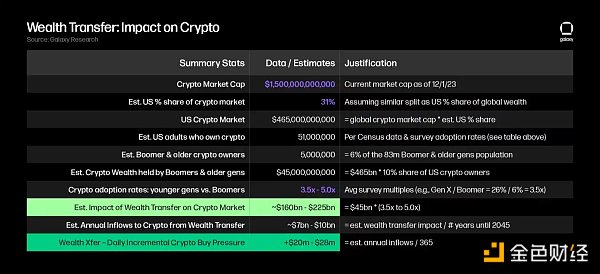 由于婴儿潮一代及老一代持有的大部分财富预计将在 2045 年前传给年轻一代,我们的估计表明, 财富转移的影响可能在未来 20 年内为加密市场每日带来 2000 万至 2800 万美元的额外购买压力。