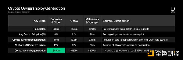 如果我们将来自调查的每代平均加密采用率应用于人口普查的人口数据,我们估计总共有 5100 万美国人拥有加密货币(与 Coinbase 估计的 5200 万相符),其中婴儿潮一代和老一代占美国加密人口的约 10%(而 X 一代占 27%,千禧一代及以下占 63%)。假设美国加密财富的估计 4650 亿美元均匀分布,我们估计婴儿潮一代和老一代目前持有约 450 亿美元的加密财富。