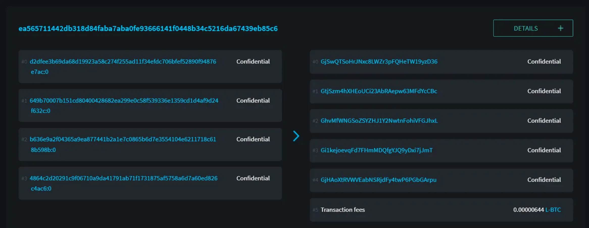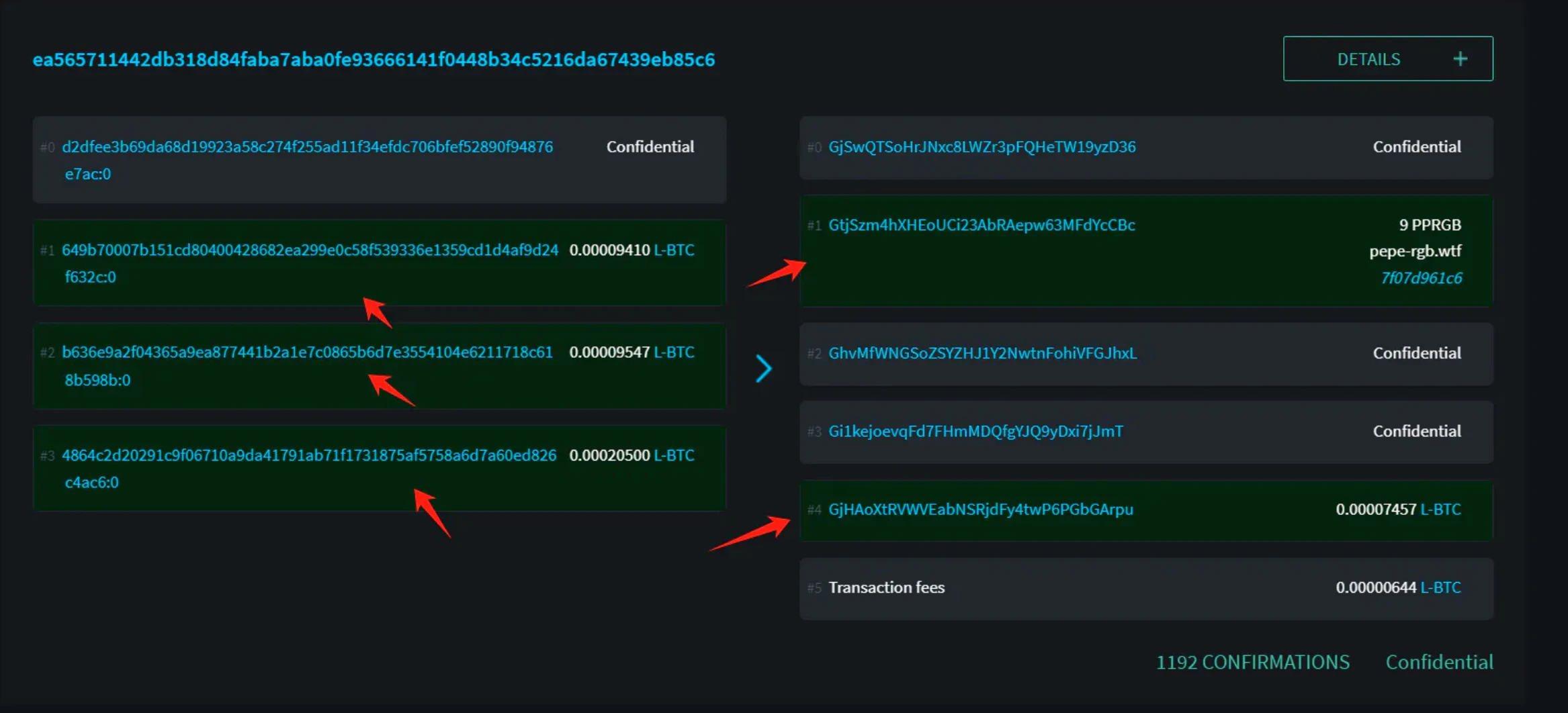 上图就是盲态数据“非盲态”后的显示,这里我只能看到自己的输入输出情况,输入是三笔 L-BTC,输出是获得 9 个 PPRGB,还有一个 L-BTC 的返回;对于交易对手,他的“非盲态数据”就是剩余的机密部分