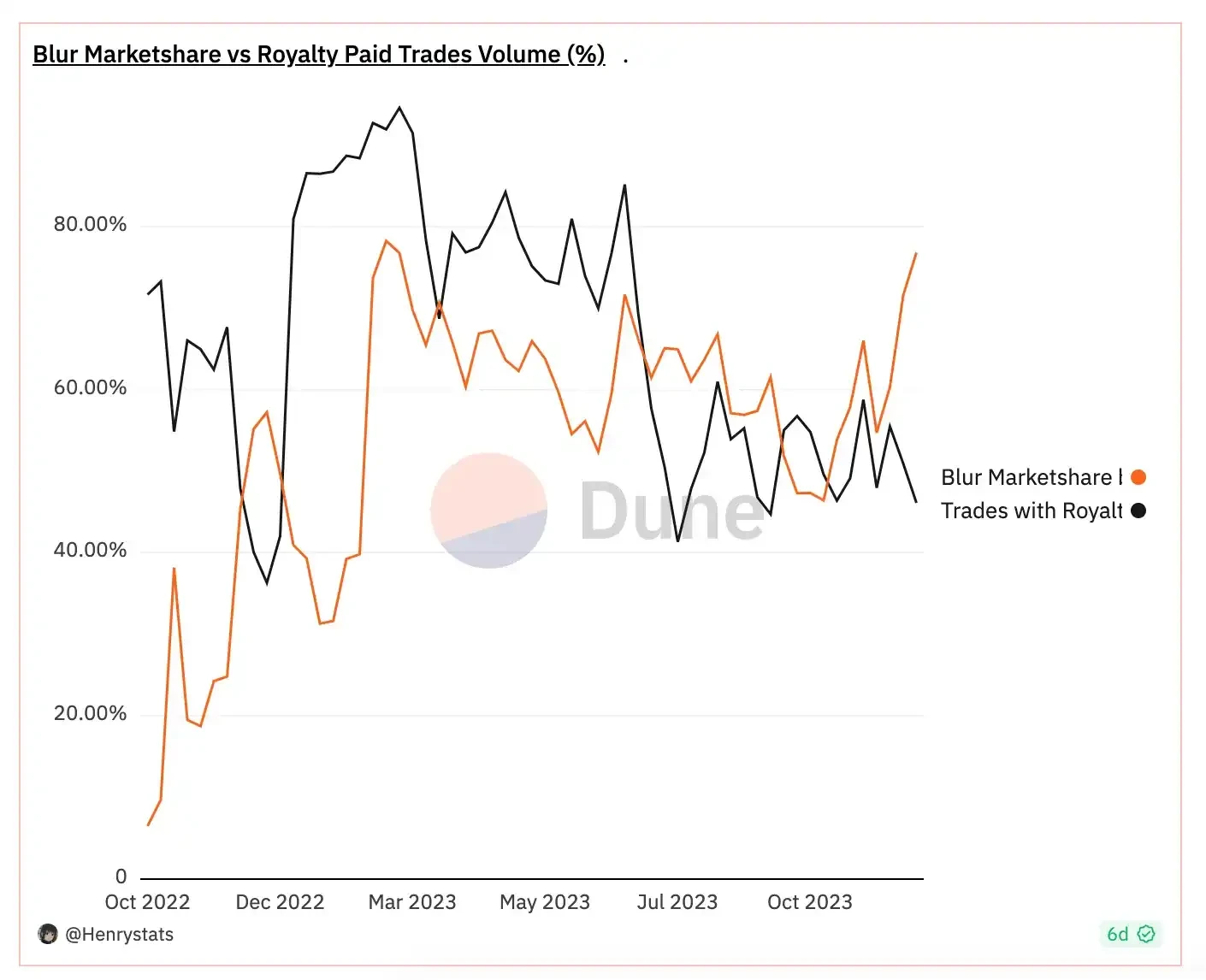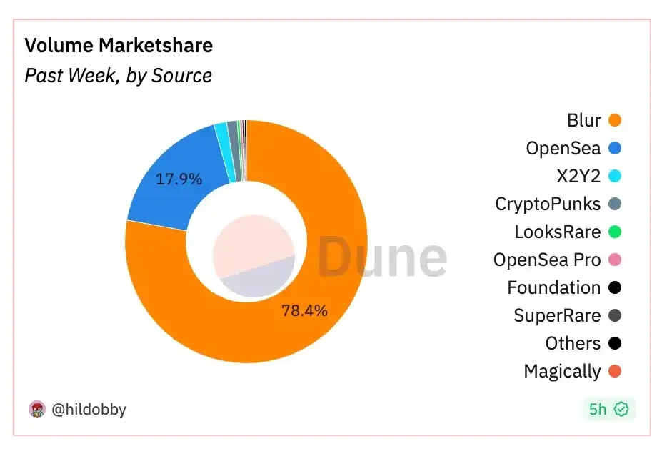 目前,超过 78% 的 NFT 总交易量发生在 Blur 上,而 OpenSea 仅占总量的不到 18% 。