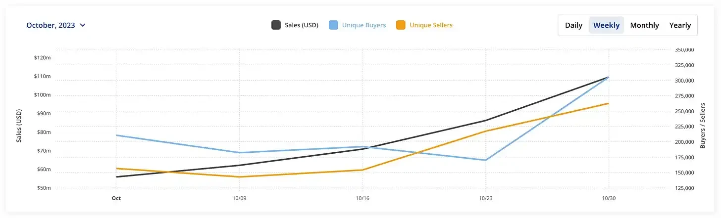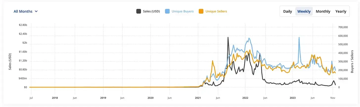 当然,如果我们将这一跃升置于更大的背景中进行考量,就需要更多的论证来说明 NFT 是否已经回归。尽管如此,我们可以观察到销售正在从遗忘中慢慢回归,与此同时,买家和卖家也在回归(可能很高兴看到他们曾在牛市拥有的 NFT,那个现在几乎毫无价值的东西,现在有了一些需求)。