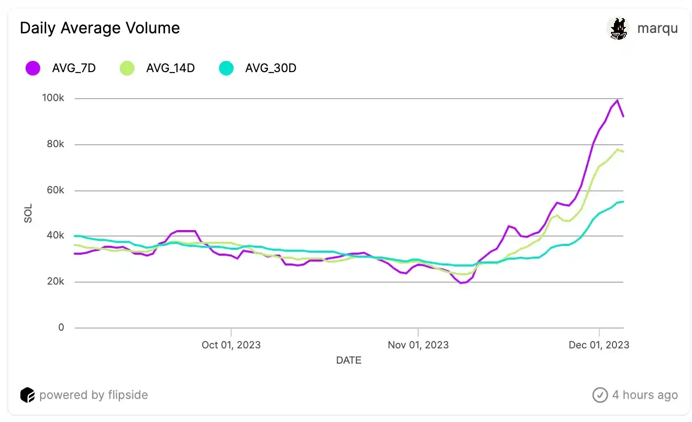 从上面的图表可以清楚地看出,Solana 的日交易量自 2023 年 11 月初以来一直在上升。