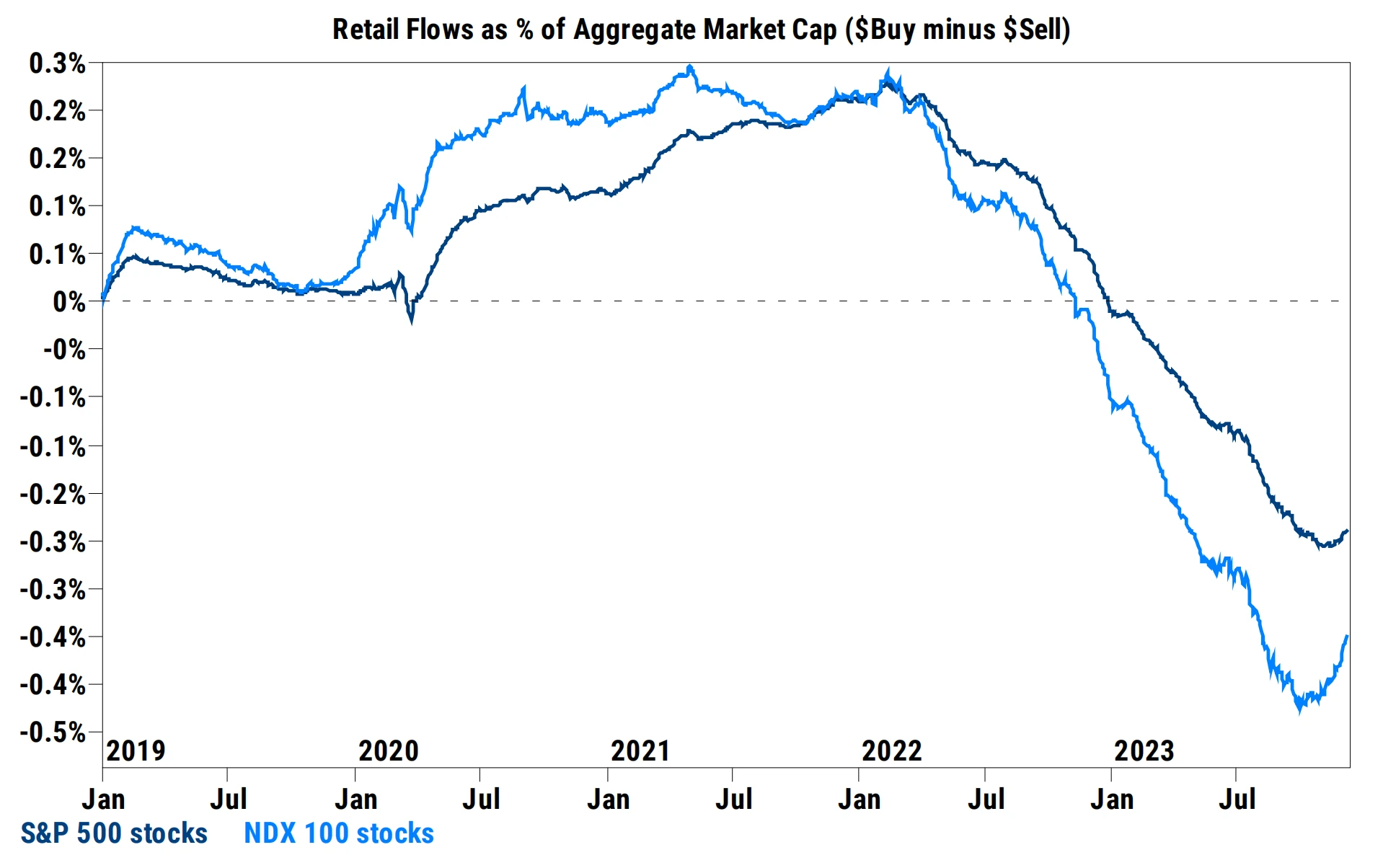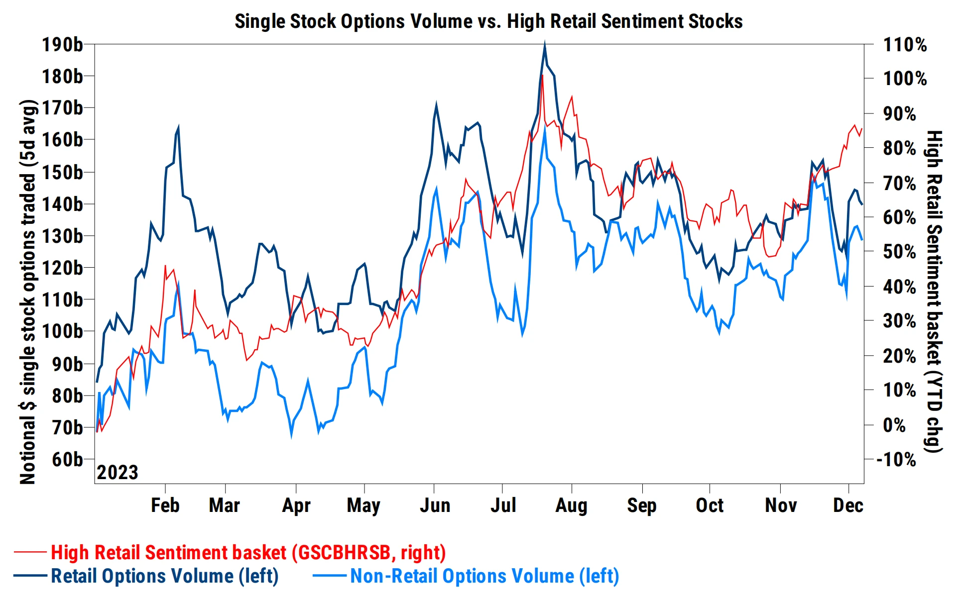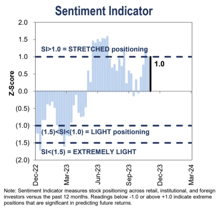 高盛情绪指标从 10 月的中性读数上升到了今天的+ 1 标准差“streched”状态。表示投资者在最近的反弹中重新增持了风险。