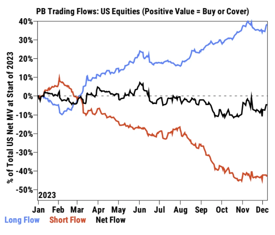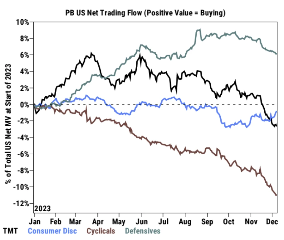 累积净交易流向显示,周期股整体跌至新低,主要是由于在能源、金融行业的净卖出导致的,科技、媒体和电信(TMT)股票:TMT 股票连续第四周出现净卖出,主要由空头卖出引领,但相较于 11 月以长期卖出为主的情况,卖出速度显著放缓。大科技在最近几周被积极卖出后,The Mag 7 本周集体实现了净买入,并在过去三个交易日中每日都有净买入: